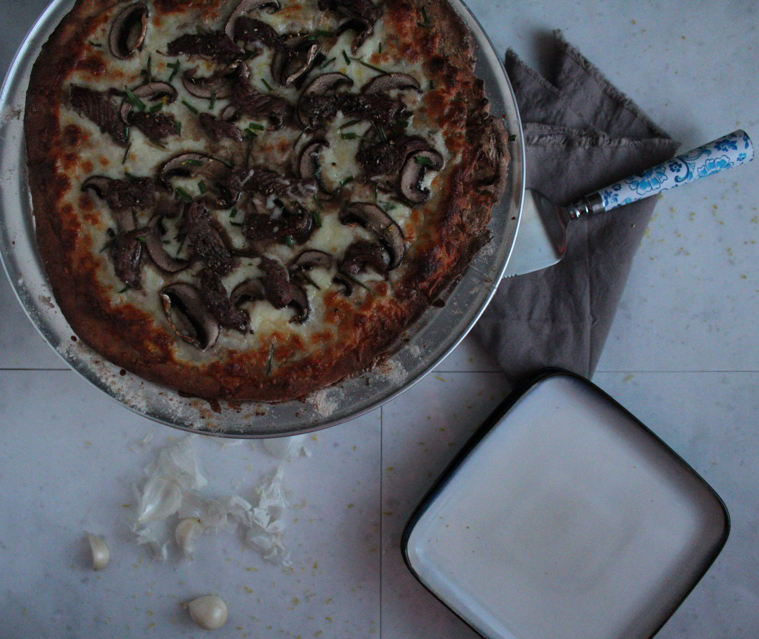 Even though it is January, which is a month of health talk, I made this pizza a few weeks ago and could not, not post it. If you know me, one of my favorite indulgences is steak. I don't eat it often, but when I do it better be damn good and creatively flavored. This recipe is that to a tee. Mushrooms are another favorite food of mine. The earthy flavor of mushrooms is just the best on pizza. If you are not a huge mushroom lover, you can always leave them at grocery store or substitute them for another vegetable.