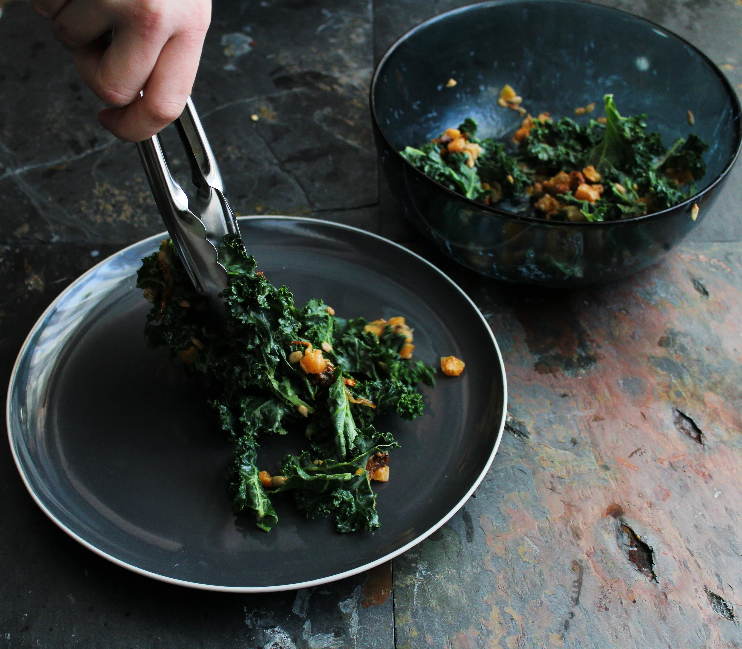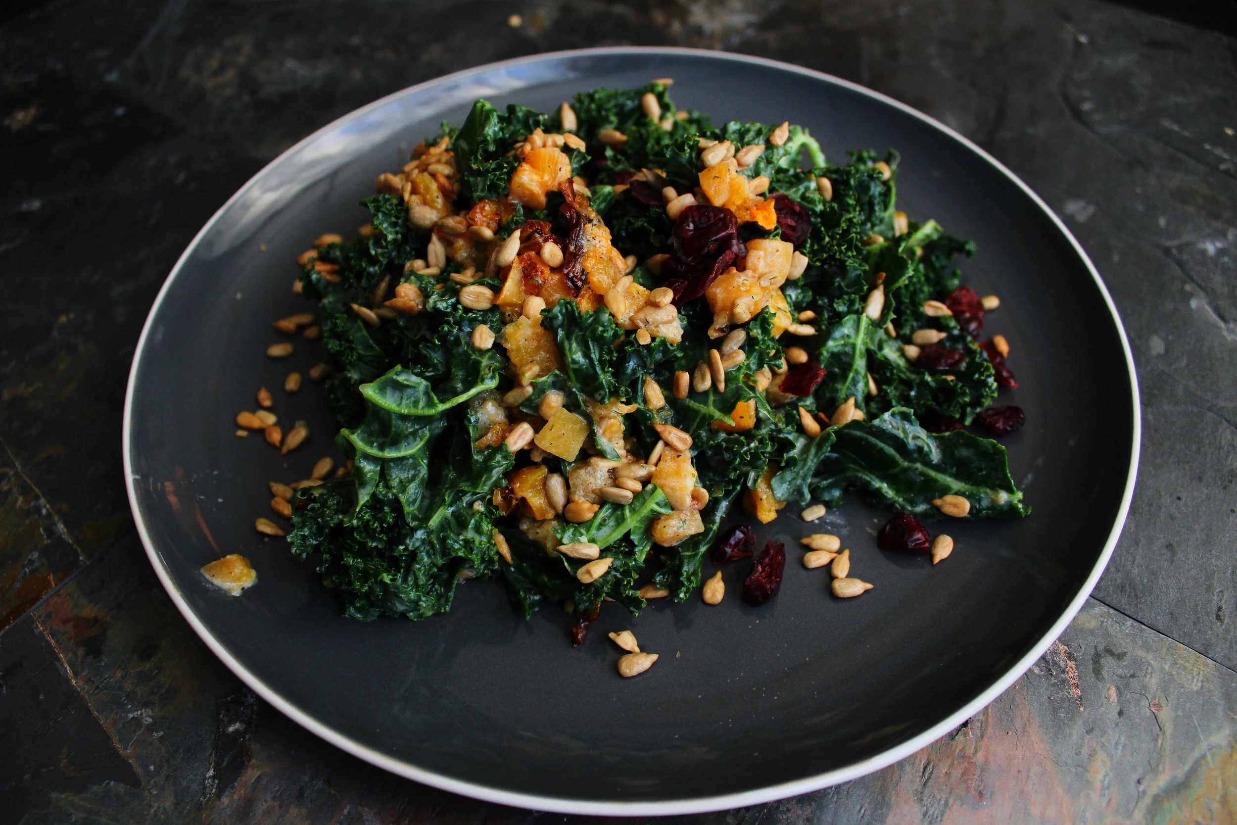- After the time is up, throw in the shallots, squash, and half of the sunflower seeds. Toss the salad one last time to ensure everything is evenly throughout the salad. Plate a heaping portion with tongs and garnish with the dried fruit and remaining sunflower seeds.