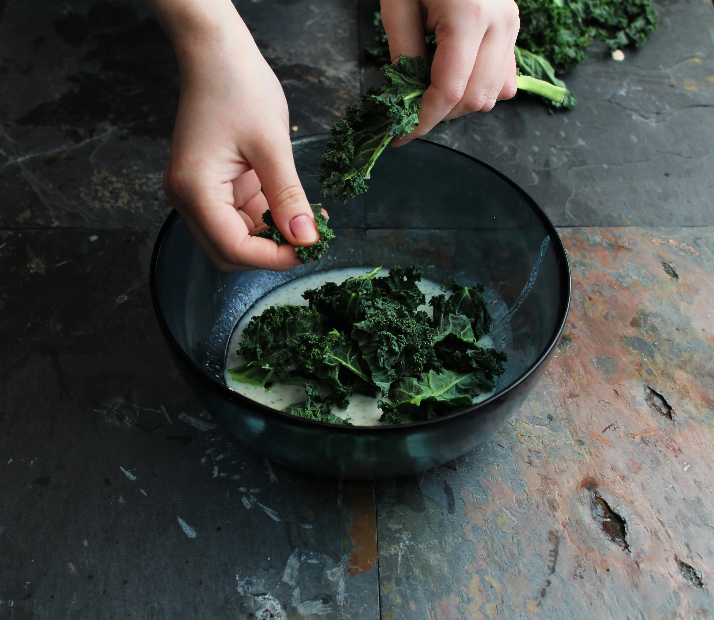- Before assembling the salad, double check that your kale is washed properly. In a large bowl, add in all of the dressing ingredients. Whisk these together until combined. Break the leaves of the kale, keeping the stem out, into small pieces. Toss the kale in your dressing and allow to sit for 4 minutes to help breakdown the kale.