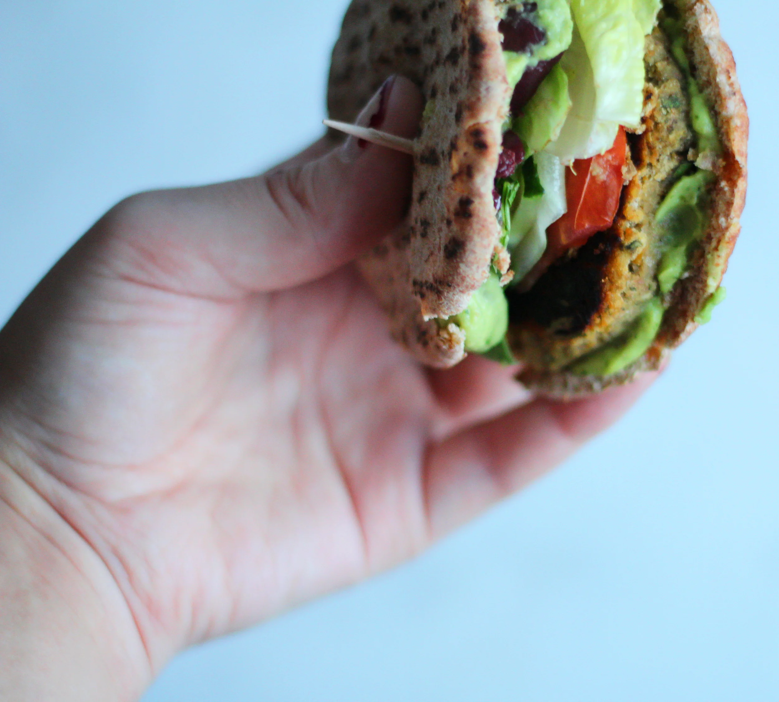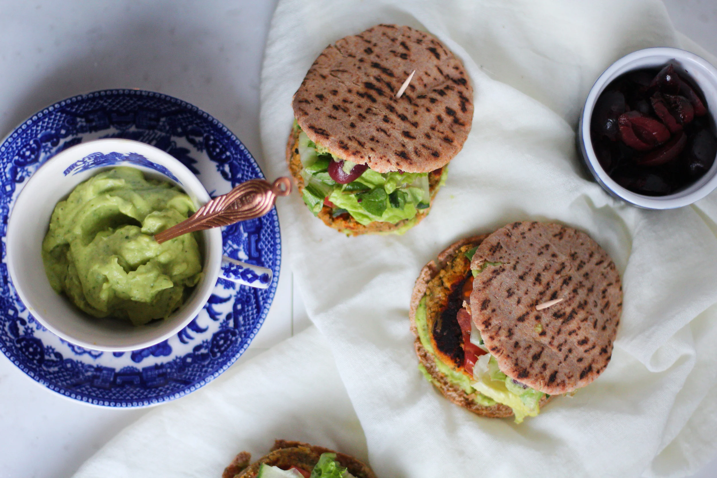 - When you are ready to assemble, cut the pita in half. This is easiest done if the pita is slightly war. Smear some avocado mousse on both sides of the pita. Add the olives to one side and press down gently to be sure they stick to the mousse. On the other side, lay the falafel patty and top with the tomato, cucumber, and lettuce. Flip the olive pita half on top and secure with a tooth pick! These are best served warm.