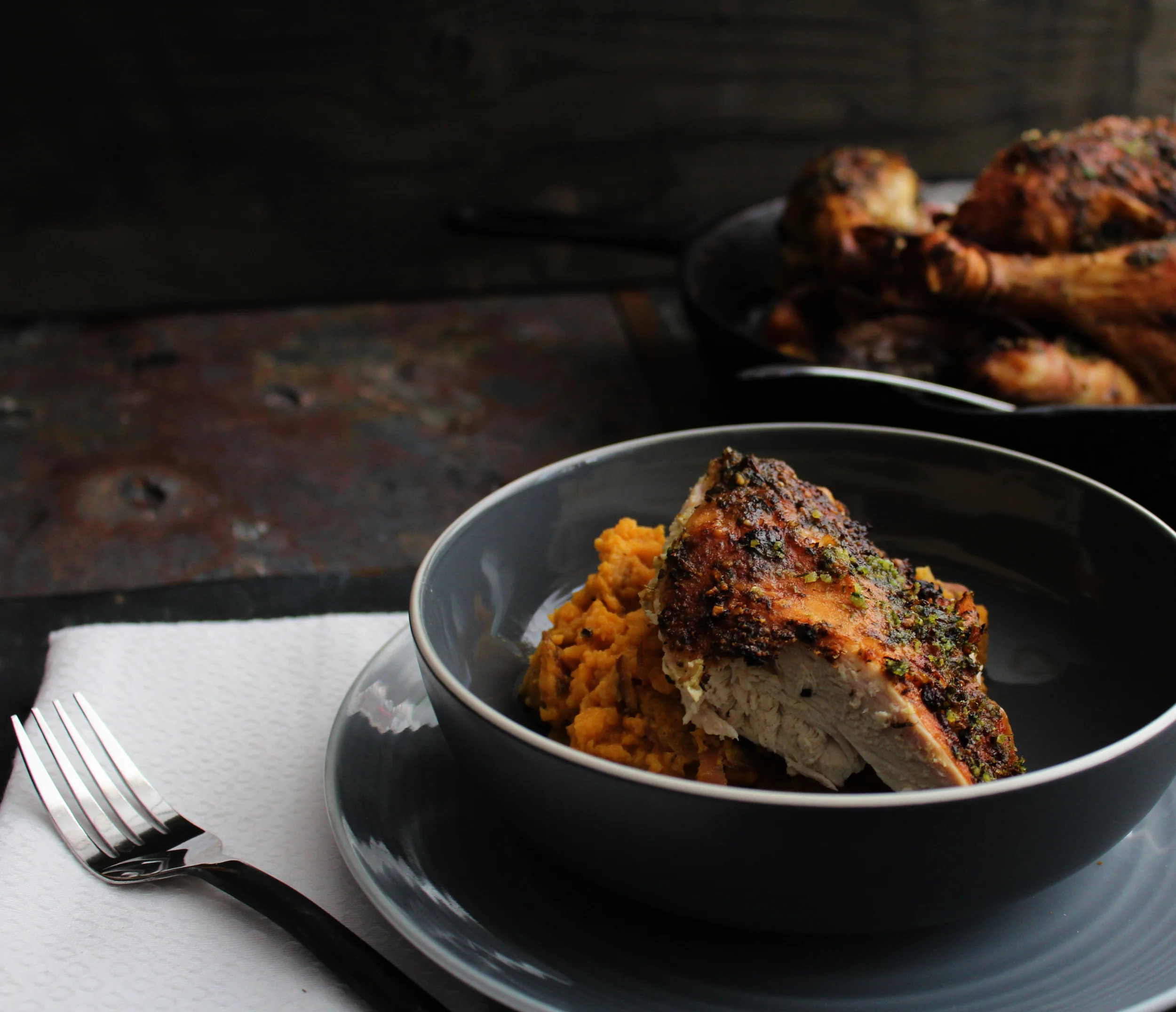 Pesto is the perfect marinade for anything really. I love green sauces that combine the flavors of herbs, spices, citrus, and garlic on meat because they bring out the sweetness you wouldn't guess was there. Pesto is one of my favorite things to make because of how quickly it can be blitzed up. I didn't include recipes for sides because I figured I'd leave that up to you. Take my recipe and pair it with your own or someone else's! I chose to whip up some honey & cinnamon sweet potato mash. Very simple & delicious which is great!