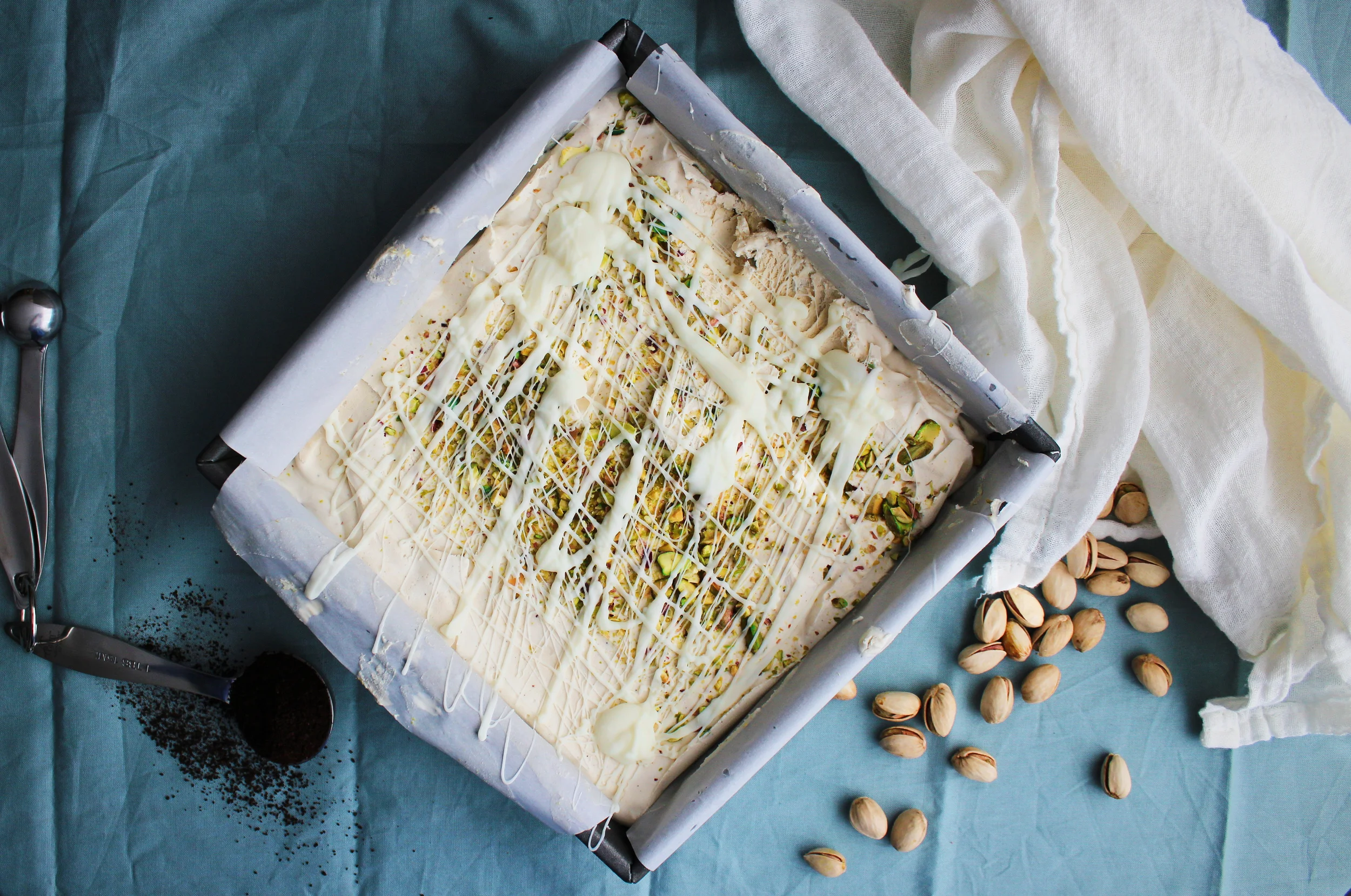 Pistachio Coffee Ice Cream with White Chocolate Drizzle